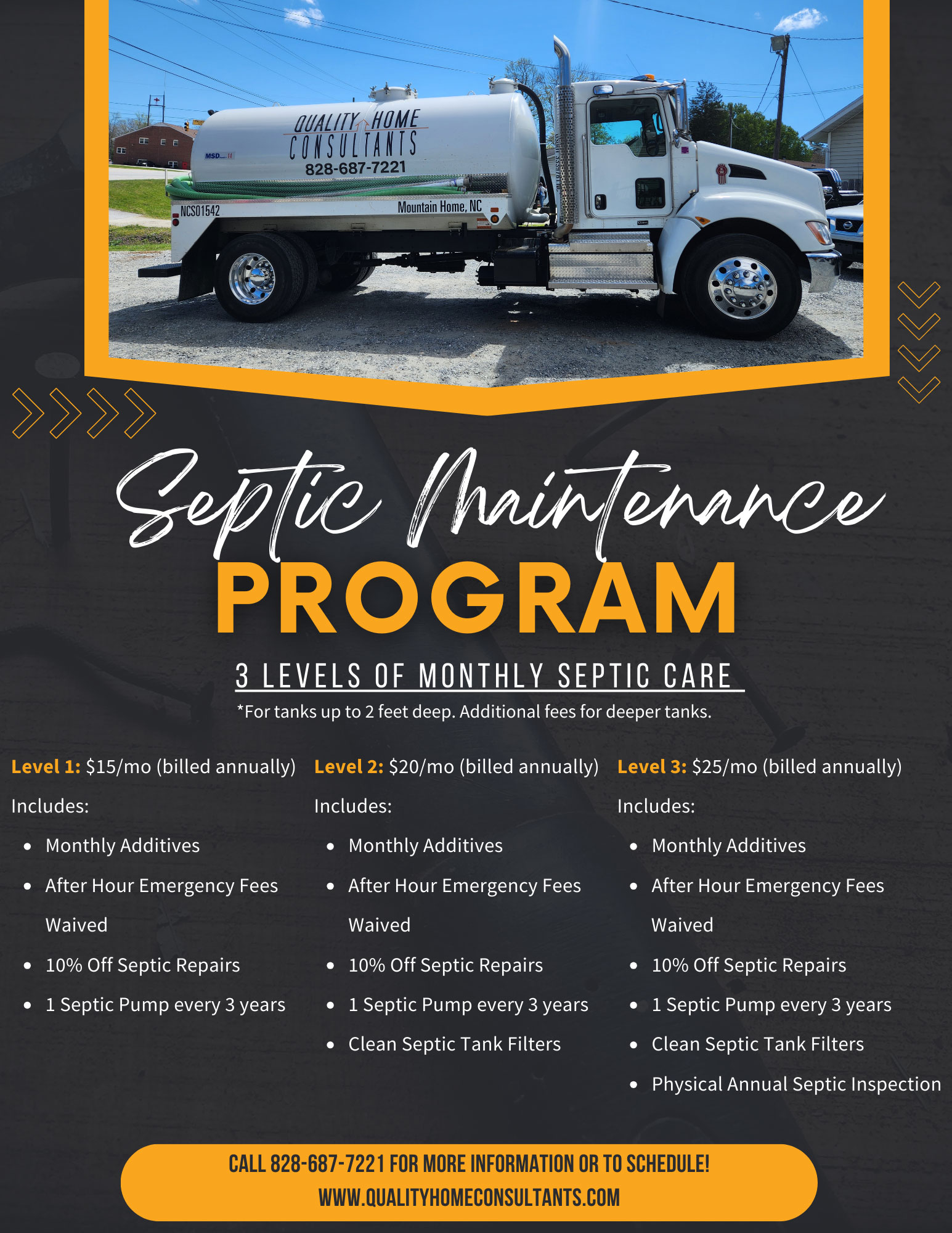 Each level of the program comes with additional benefits including pumping of the tank, discounts on septic repairs, the monthly additives, and more!
